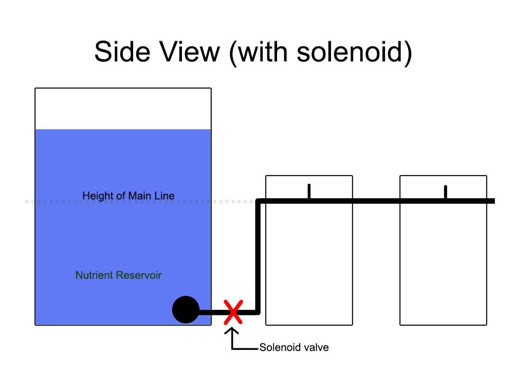 - Use a low reservoir and ensure the 1/2″ main feed line and drippers are lower than the nutrient level